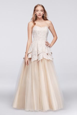The gracefully layered lace peplum bodice of this stunning, tulle-skirt ball gown has the feel of a flower in bloom. This style is exclusive to David's Bridal.