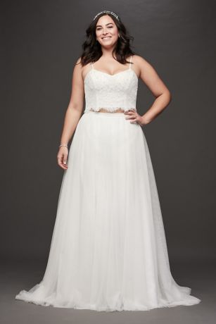 A whimsical approach to a traditional wedding dress, this two-piece set features a spaghetti-strap lace top with a buttoned back and a sweeping, A-line tulle skirt.