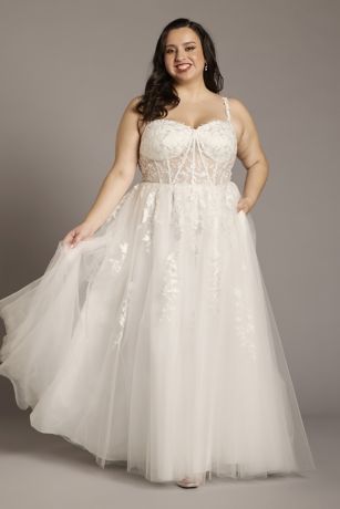 Intricate lace appliques bring this tulle ball gown wedding dress to life, dancing across the spaghetti straps, illusion bodice and back, and flowy skirt.