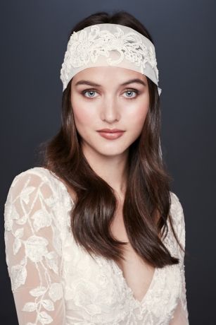 Add boho glam to your wedding look with this lace-applique-topped wide tulle headband.
