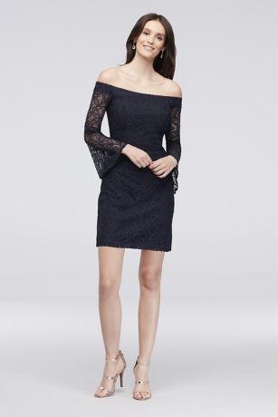 Sheer lace bell sleeves add fun, fashion-forward detailing to this short off-the-shoulder sheath dress.
