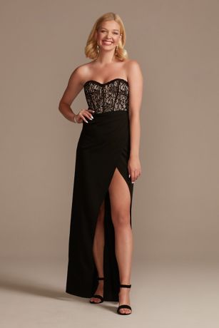 With an asymmetrical waistline, textured lace bodice, and slit-accented skirt, this floor-length strapless crepe dress is a sexy, modern take on a classic sheath silhouette.