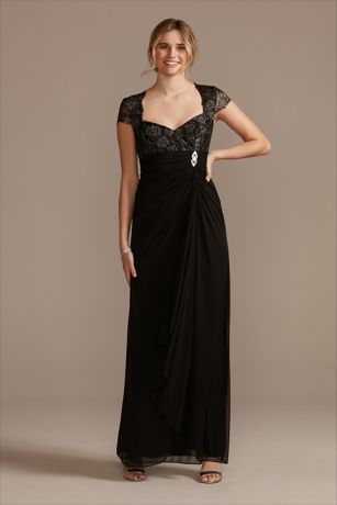 Featuring a lace bodice with a V-neckline and cap sleeves, and a gathered mesh skirt, this sheath dress is a delightful choice for the mother of the bride or groom.