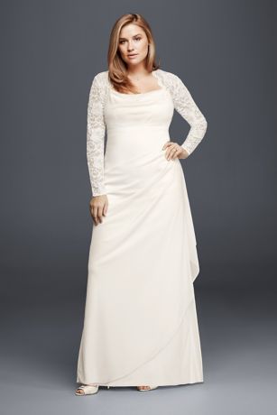 You will look breathtaking in this lace and mesh wedding dress. The empire bodice with eye-catching open back detail and long lace sleeves provide a timeless silhouette, while the side drape mesh skirt adds a bit of dimension.