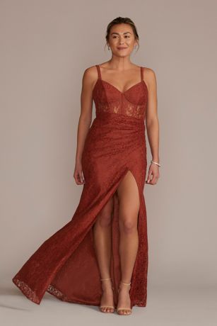 Lace looks totally luxe on this corset bridesmaid dress with a sheer bodice, side drape, and high slit. Features bra cups.
