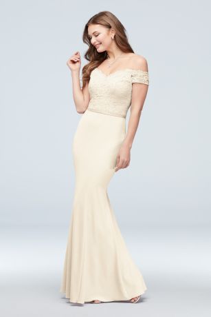Stand by the bride's side in this lovely off-the-shoulder stretch crepe and lace bridesmaid dress. Glamorous lace is paired with a body-hugging stretch-crepe skirt and finished with a crepe-backed satin belt.