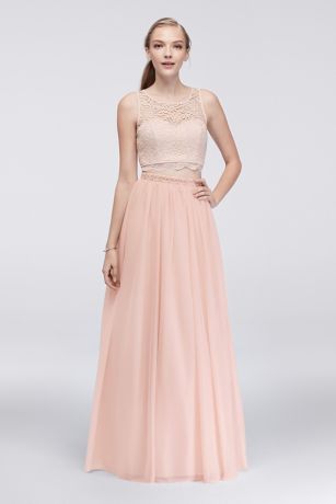 One of the hottest fashion trends, the crop top is a must-have for prom season. This two-piece dress features a lacy illusion crop top which perfectly shows off the beaded waistband of the long jersey skirt.