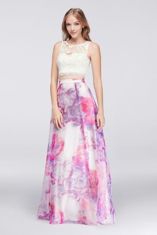 One of fashion's hottest trends, the crop top is a must-have for prom season. This two-piece dress features a scalloped guipure lace top and a full, floral-printed organza skirt.
