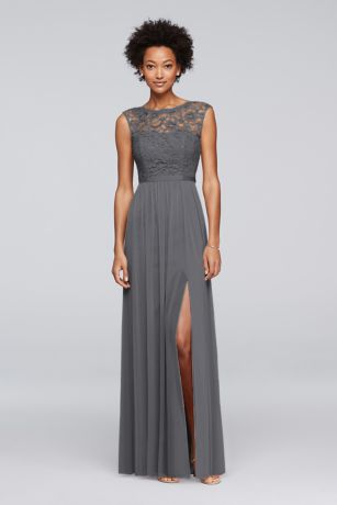 Looking for a little lace for your bridesmaids This long bridesmaid dress features a lace bodice, an illusion neckline, a ribbon-defined waist, and a fluid mesh skirt with a slit.