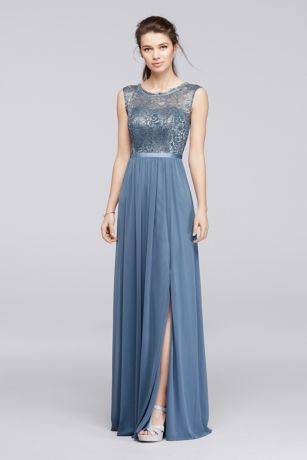 Looking for a little lace for your bridesmaids This long bridesmaid dress features a lace bodice, an illusion neckline, a ribbon-defined waist, and a fluid mesh skirt with a slit.
