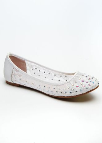 - Lace flat shoes are adorned with AB crystals.