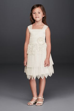 This storybook flower girl dress features layers of sweet lace and a 3D rosette atop an airy lace skirt. Wide lace straps complete the delightful look.