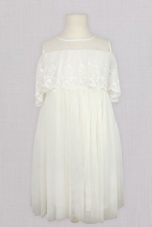 Crafted of airy tulle, this sweet flower girl dress features an illusion mesh neckline with an off-the-shoulder lace ruffle.