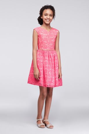 A beaded belt adds sparkle to this lace dress that's perfect for junior bridesmaids. Cap sleeves and a notched neckline complete the look.