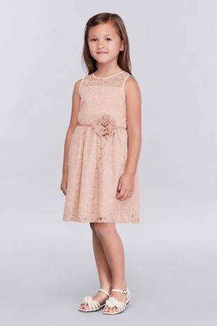 She'll feel all grown up in a pretty lace dress with a full skirt. The sleeveless bodice has a sweet illusion neckline and delicate floral detailing along the natural waist.