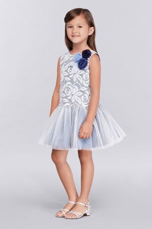 Floral lace blooms on the drop-waist bodice of this darling dress, which flows into an airy tulle skirt with gentle gathering at the waist for added fullness. A trio of coordinating tulle flowers at one shoulder takes it from pretty to fit-for-a-princess.