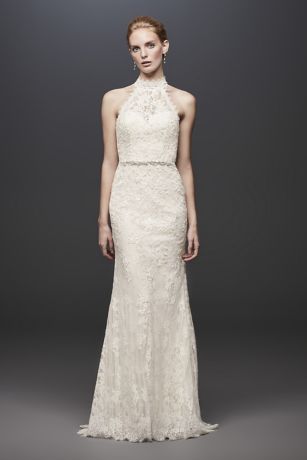 This high-neck halter wedding dress is a fresh silhouette featuring vintage-inspired details. Linear lace paired with soutache ribbon appliques give this dress a one-of-a-kind heirloom look. The gown is finished with a low illusion-lace back and scalloped trim.