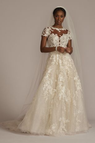 Luxurious beaded lace cascades over a shimmering metallic underlay in this majestic ball gown wedding dress. The open back is accented by delicate buttons and cap sleeves with floral appliques.