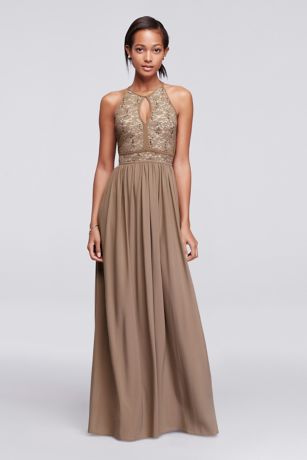 Radiate effortless beauty in this tie back halter dress with keyhole detail! The lace bodice is adorned with sparkling sequins for a subtle pop of sparkle.