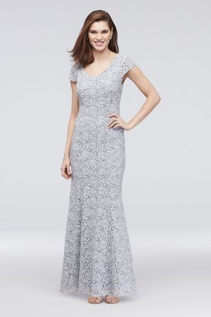 This short-sleeve lace mermaid petite dress features floral piping and a dusting of sparkling sequins.
