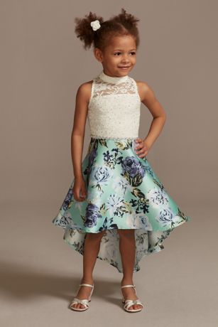 Lace Mock Neck High-Low Printed Flower Girl Dress