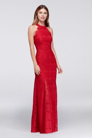 This long lace column dress is edged with eyelash fringe at the halter bodice before flowing into a softly sweeping skirt.