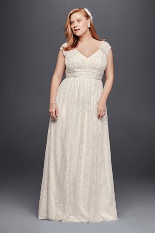 The delicate illusion lace cap sleeves perfectly balance the slightly more sultry plunging V-neckline on this sheath wedding dress. Scalloped lace trim at the arms and neckline adds another feminine layer to the ladylike look.