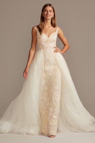 Show-stopping elegance is yours with this allover lace sheath wedding dress with a removable tulle overskirt. Covered in opulent beading, the illusion tank dress is sleek and sophisticated. Once you add the flowing tulle overskirt, the drama is dialed up, making it perfect for walking down a grand aisle or your reception entrance.