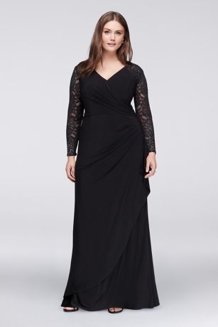 Beautiful crystal-detailed lace sleeves add just a hint of shine to this faux-wrap matte jersey A-line gown.
