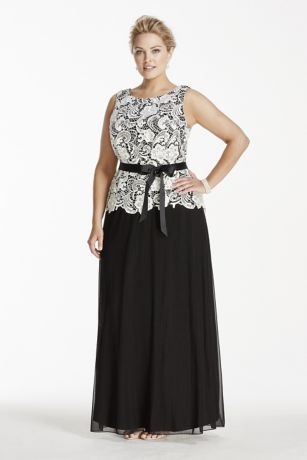 - Long A-line dress features an ultra-feminine floral lace tank bodice with a satin sash.