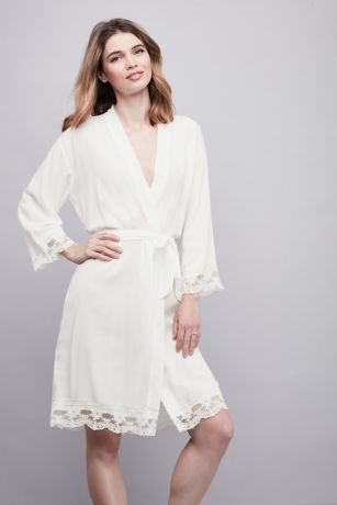 This woven rayon bride robe is finished in pretty crochet lace and gold foil printing.
