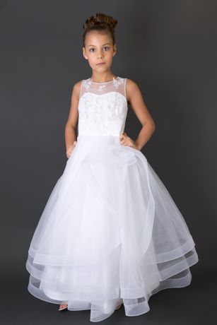 Featuring a cutout, lace-up back, a corded lace bodice, and a horsehair hem, this communion ball gown is exquisite. This style would also be perfect as a flower girl dress.