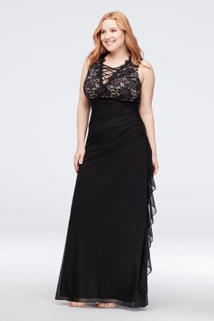 This gathered chiffon and lace sheath dress gets extra detail from a lace-up detail at the V-neckline.