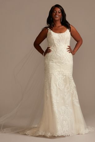 Five different types of lace and a sleek scoop neckline make this mermaid wedding dress unique, but the extravagant low back is what sets it apart: crafted with a sheer appliqued lace, the chapel-length train makes for a dramatic entrance and exit.