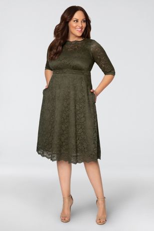 This elegant party dress was designed specifically to flatter plus-size figures. With a scalloped, illusion bateau neckline and elbow sleeves, the stretch-lace fit-and-flare features covers bra-concealing tank straps, and a soft, graceful, scalloped lace skirt.