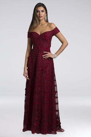 Lattice lace covered in rhinestones and 3D flowers give this off-the-shoulder A-line gown an extra-special feel.