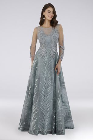 Beads and lace create a tonal palm frond motif atop this stunning high-neck ball gown. Illusion lace sleeves and a flowing sweep train complete the look.