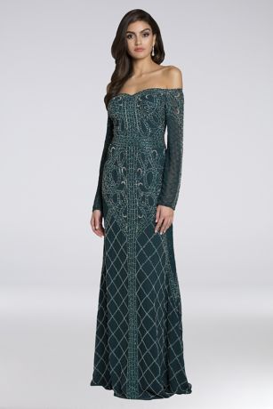 Beaded vine and lattice patterns embellish this chiffon off-the-shoulder sheath gown with intricate detail. The elegant silhouette is completed with a sweetheart neckline and long sleeves.