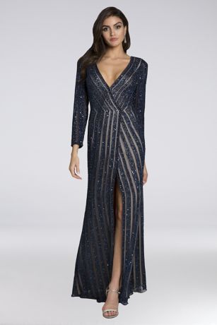 All we can say is, "Wow!" This fitted, long-sleeve faux-wrap gown is encrusted with glittering beaded stripes, and features a deep V-neckline and a dramatic slit skirt.