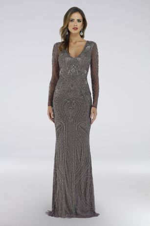 All eyes will be on you in this glamorous beaded sheath dress, featuring a flattering V-neckline and sheer long sleeves.