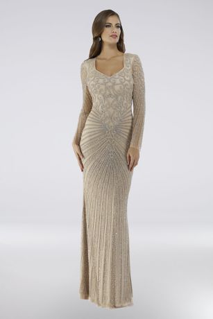 This floor-length V-neck gown is covered in crystal stones and detailed with sheer long sleeves.