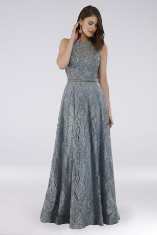 The beautiful lace sleeveless ball gown features a high neckline, geometric beading, and a glimmering rhinestone belt. Complete with a sweep train.