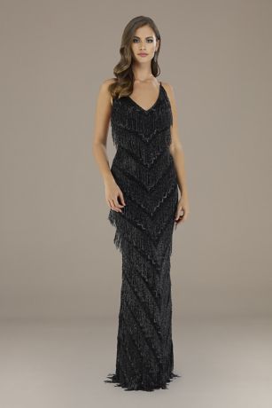 Diagonal layers of beaded fringe give this sheath dress some serious wow power. A plunging V-neckline and an elegant sweep train complete the look.