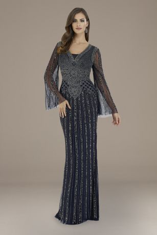 Long, sheer bell sleeves and a V-neckline add sophisticated detail to the ornately beaded bodice of this dress, while shimmery beaded stripes give the mermaid skirt a bold look. Complete with a sweep train.