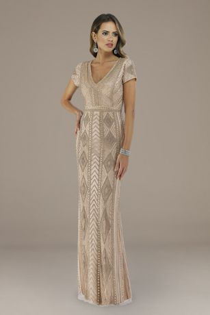 This fitted gown features allover geometric beading, chic short sleeves, and a flattering V-neckline.