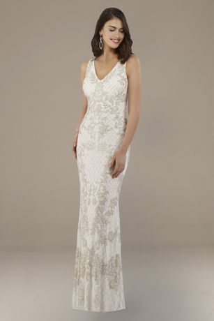 Detailed with a V-neckline, and adorned with beaded vine and lattice motifs, this beautiful sheath wedding dress is simply exquisite.