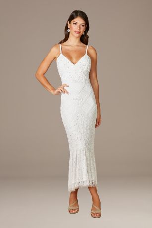 The beautiful deep V-neck, detailed beading, and faux mermaid skirt make this wedding dress as whimsical and glamourous as the bride who wears it.
