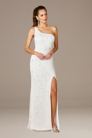 Radiate romance in this formfitting one-shoulder wedding gown, complete with intricately beaded floral details and a sexy skirt slit.