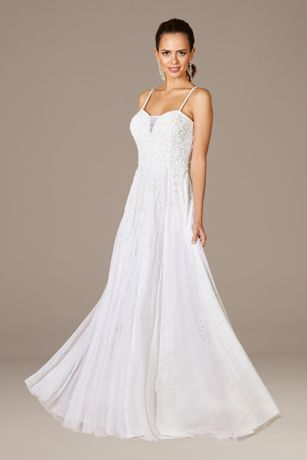 From the sweetheart neckline to the intricately beaded tulle skirt, this spaghetti strap wedding gown is full of romantic details.