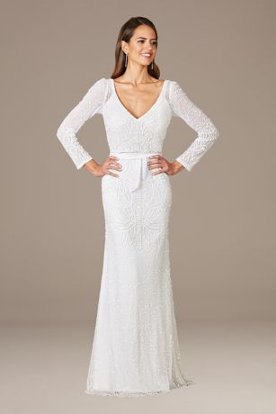 Capture everyone's attention in this figure-hugging, full-length beaded wedding dress, complete with long sleeves, a V-neck, and cinched waist detailing.